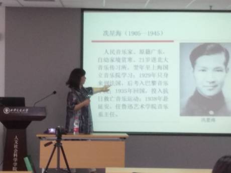讲座正式开始时,李娟老师首先将大家的思绪带回到了1939年那动荡、战乱的中旧中国,并提出问题:“在这样的时代,表达自己爱国情感最好的方式是什么?”答案显而易见,是音乐。 李娟老师指出,相对于文学、绘画等其他艺术门类,人类的大脑皮层感知音乐是最直接的,因此音乐最能直接的激发人的情感,这也是在那个动荡的时代,能够涌现出如此多经典的红色音乐作品的原因。