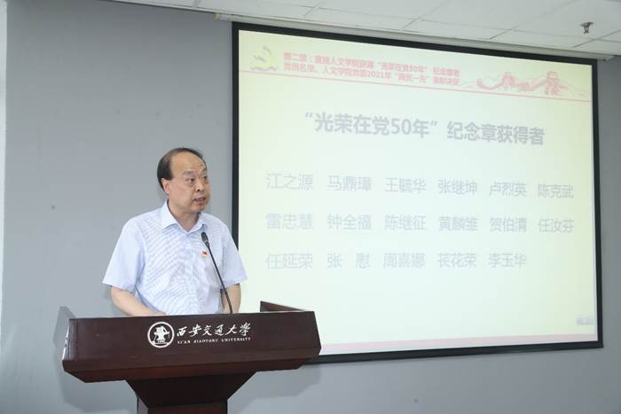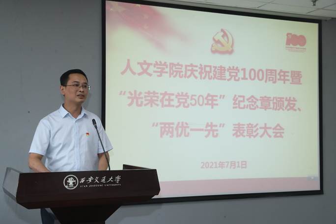 党委书记许佳辉首先带领大家学习了习近平总书记在庆祝中国共产党成立100周年大会上的重要讲话。他强调学院党委和各支部要把学习习近平总书记在庆祝中国共产党成立100周年上的重要精神作为当前首要的政治任务,将讲话精神作为推进高等教育高质量发展的根本遵循和行动指南,带领全院师生结合党史学习教育,牢牢把握正确的政治方向,坚持立德树人根本任务,落实“办好学科专业、推进人文与科技并重、助力人文交大”三大攻坚任务,凝聚奋进力量,为高质量教育体系建设贡献智慧和力量。他号召全体党员要向获得“光荣在党50年”纪念章的老同志和“两优一先”的集体和个人学习,在学院营造见贤思齐、创先争优的良好氛围,传承好学院发展的接力棒,建强党的基层组织,发挥党员先锋模范作用。