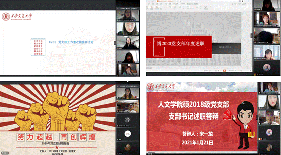 本次述职答辩由闫潇主持,闫潇介绍了本次支部考评细则。各学生党支部书记根据校党委《关于做好2020年度基层党建和全面从严治党述职评议考核工作的通知》精神就支部工作进行述职,重点突出支部“围绕中心抓党建,抓好党建促发展”的特色经验和实际成效。各支书的汇报从传达精神、落实工作、推动党团班一体化建设、组织宣传师生、服务师生、日常党建工作六个方面对过去一年的党支部工作进行总结,并分析存在的问题与未来整改方向。