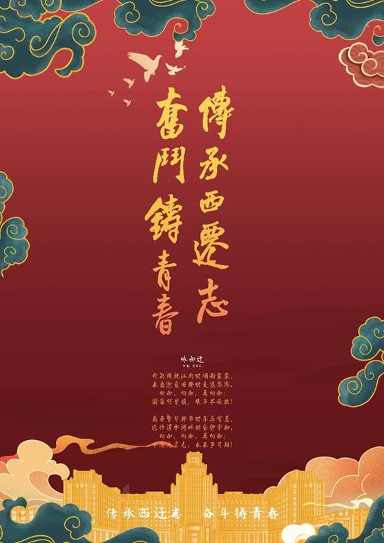 “把根牢牢扎在黄土地上,把爱深深融入西北血脉”,文字与背景用最简洁的色调相搭配,黑白相间,融为一体,体现出“西迁”这一历史使命带给我们经过时间洗涤和岁月沉淀的情感。